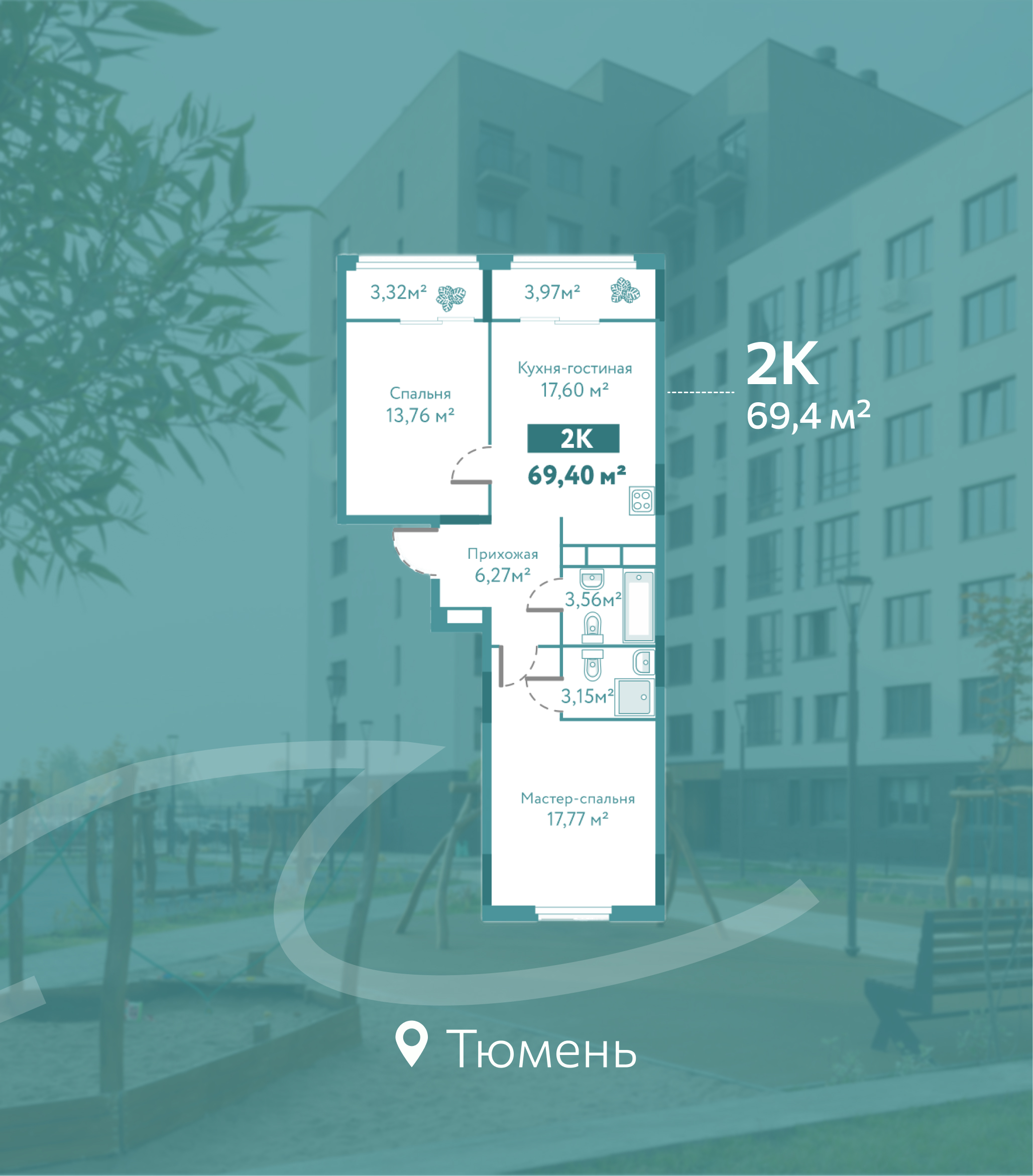 Двушка за 45 109 ₽/мес в ЖК у реки